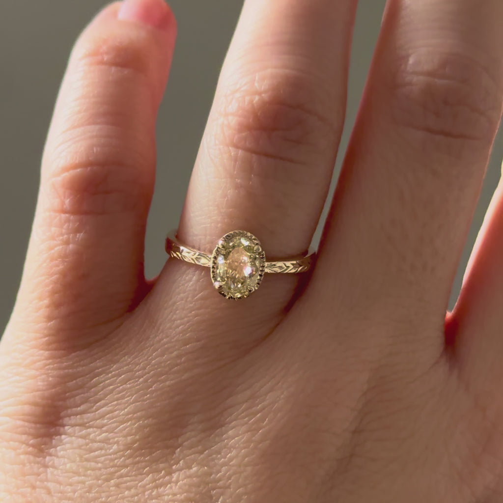An oval yellow diamond set low in 9ct gold, framed by a slim bezel with prongs, with laurel leaves engraved along each shoulder.