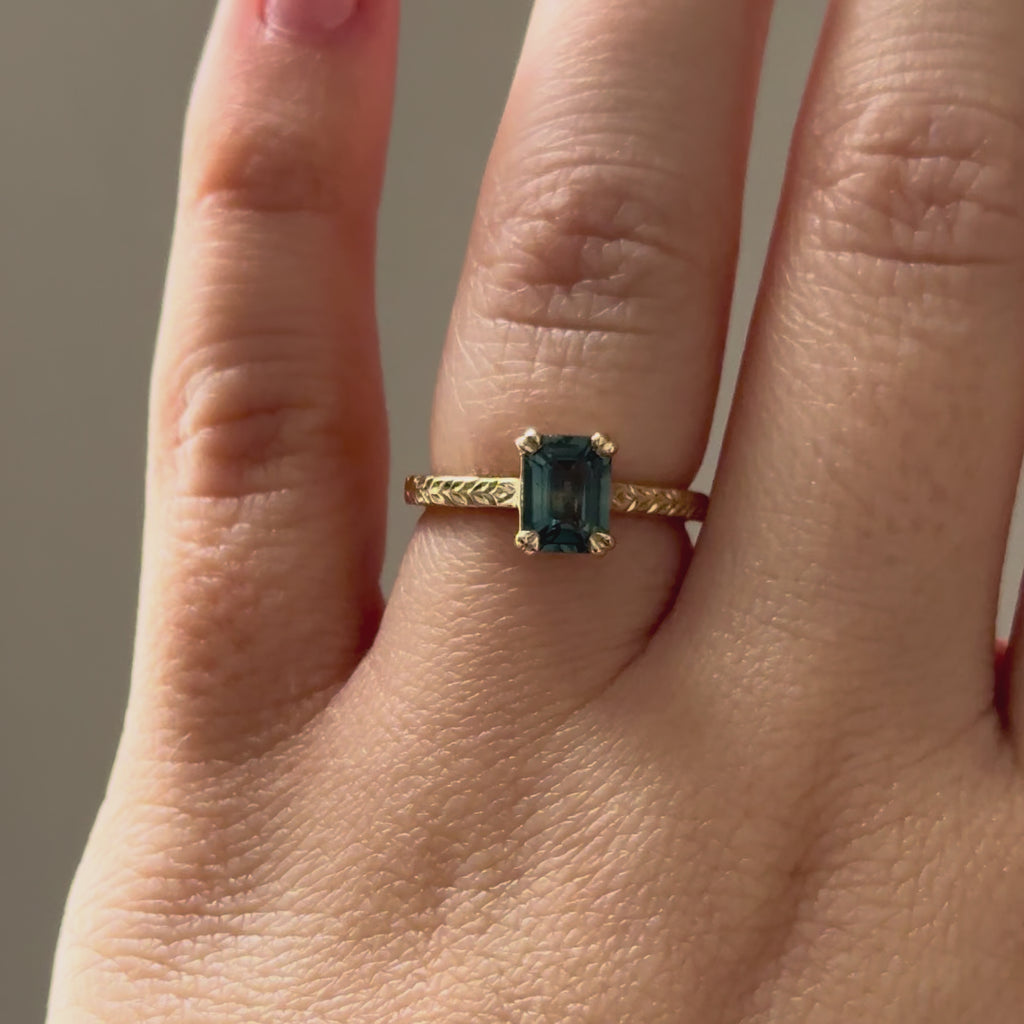 I designed Elowyn as a gentle vow in metal and stone, your choice of centre stone with this customisable ring setting. Along the shoulders, I’ve hand-engraved laurel leaves to symbolise a love that keeps flourishing. The silhouette is airy and romantic, with a soft open gallery with either a six prong tulip setting or four double prongs.